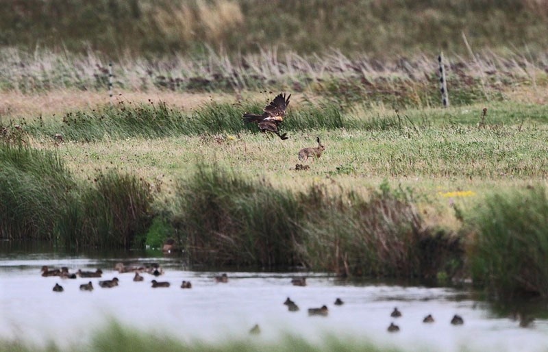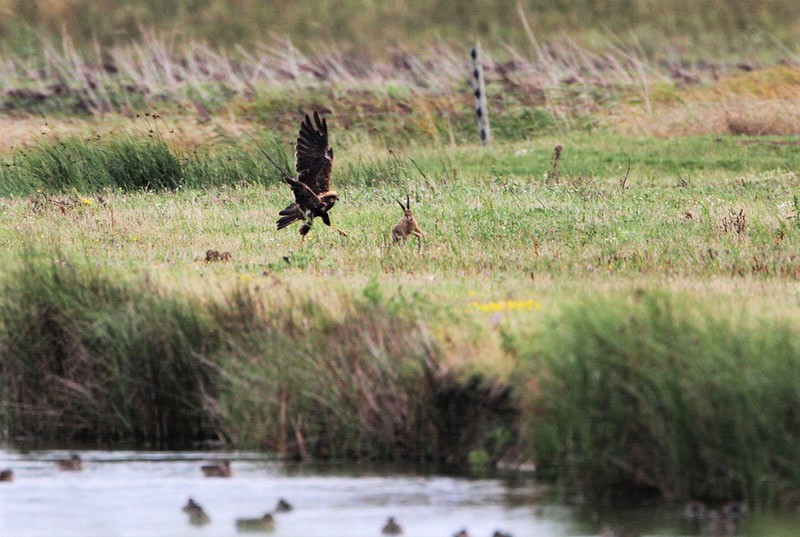 The Hare escaped the claws of the Marsh Harrier, both appeared to assess their position, the Hare had made clear that it was prepared to fight and the Harrier was not prepared to risk injury.
